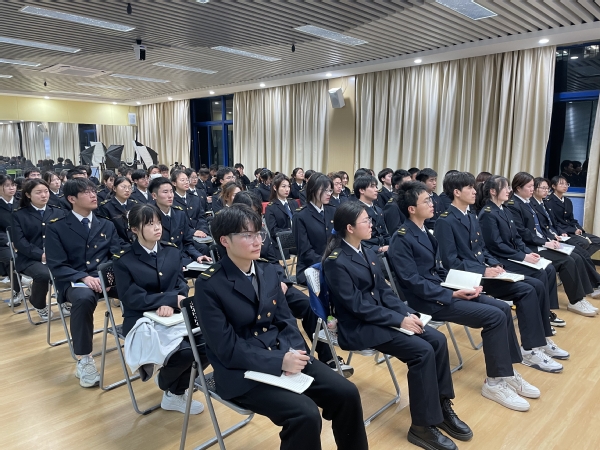 然后,喻诗祥老师以新时代下,学校建设发展方向为切入点,带领同学们重新认识学校 “一体两翼、多维拓展”航母战斗集群式的专业布局,了解海事专业的优势,及未来就业的方向。