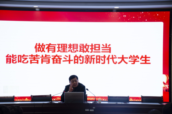 陈友放教授以习近平总书记在中国共产党第二十次全国代表大会上的讲话内容为切入点,结合国情党情,从一个视角、一个主题、两个答案、两个行、三个务必、三件大事入手,教育同学们争做有理想、敢担当、能吃苦、肯奋斗的新时代大学生。
