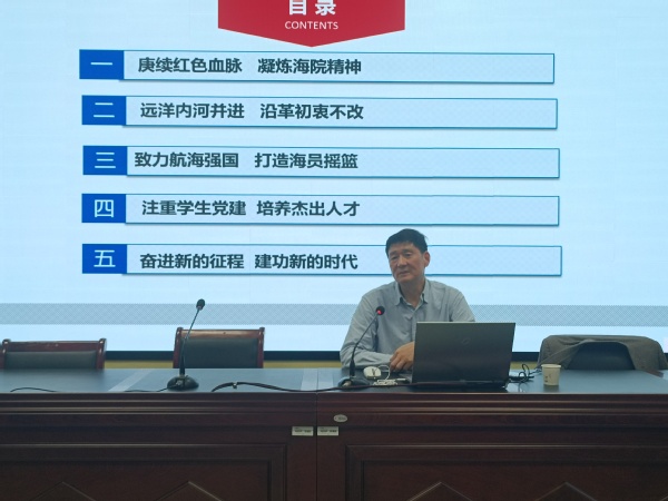 喻诗祥老师首先从学校建校的历史入手,带领同学们从董华民与香港招商局起义开始,重新认识学校的历史。他用一个个生动的故事,告诉同学们新中国第一所海员学校开班、扩建、合并中的种种不易。 喻老师还向同学们具体详细地介绍了学校的从南京海员训练班至今的建校历程,让同学们更深刻地了解到学校的变革,明白学校的专业特色。最后,喻老师给同学们介绍了学校近年来获得的荣誉,同时对同学们提出要求:作为当代大学生,要胸怀共产主义远大理想,正确认识时代责任和历史使命,勇做走在时代前列的奋进者、开拓者。要把远大抱负落实到实际行动中,让勤奋学习成为青春飞扬的动力,让增长本领成为青春搏击的能量。