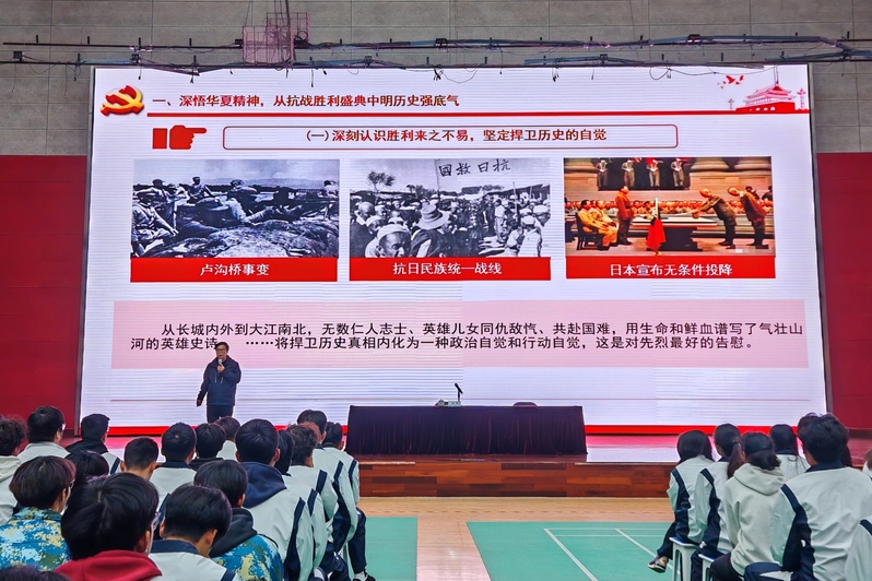 谢荣教授围绕“深悟华夏精神,从盛典中明历史强底气”“汲取东方智慧,从启示中蓄力量明方向”以及“践行报国之志,将感悟转化为学习动力”三大主题展开。从80年前中华民族以血肉之躯赢得近代以来反抗外敌入侵第一次完全胜利的壮阔史诗,到抗战胜利盛典上国之重器彰显的大国底气,系统阐释了“正义必胜、和平必胜、人民必胜”的历史真理。通过回顾抗日民族统一战线的形成、抗战英模部队的英雄事迹,深入解读了伟大抗战精神中蕴含的爱国主义情怀、民族气节与必胜信念,让学子们深刻认识到胜利的来之不易与斗争精神的永恒价值。最后,谢荣教授向在座的青年学子提出三点期望:一是要铸牢思想之魂,深入学习贯彻习近平新时代中国特色社会主义思想,把党的科学理论作为青春理想的指路明灯;二是要传承红色基因,从抗战精神中汲取奋进力量,转化为砥砺前行的强大动力;三是要勇于创新破难,在学习实践中锤炼过硬本领,以实际行动向党组织靠拢,为全面建设社会主义现代化国家、实现中华民族伟大复兴的中国梦贡献青春力量。